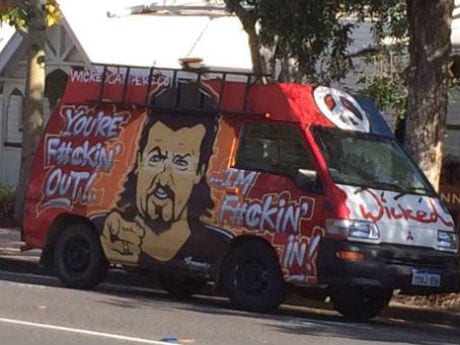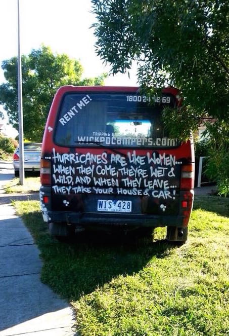 The van below caused a mother, Christine King, to contact Wicked Campers due to the fact this particular van was parked outside a busy cafe area in Brisbane in November – at the school pick-up time – the main part that was visible to her and her kids (as seen from her photo below) said: You’re F#ckin’ Out! I’m F#ckin’ In!