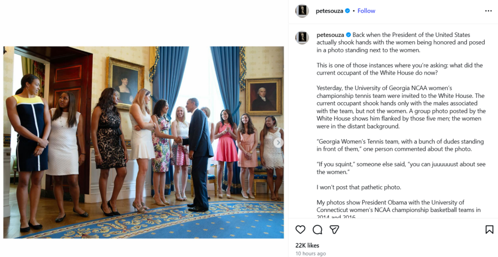 “Yesterday, the University of Georgia NCAA women’s championship tennis team were invited to the White House. The current occupant shook hands only with the males associated with the team, but not the women. A group photo posted by the White House shows him flanked by those five men; the women were in the distant background.